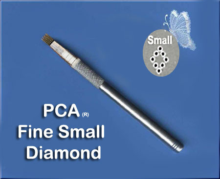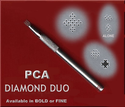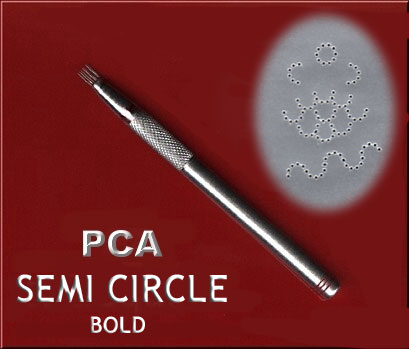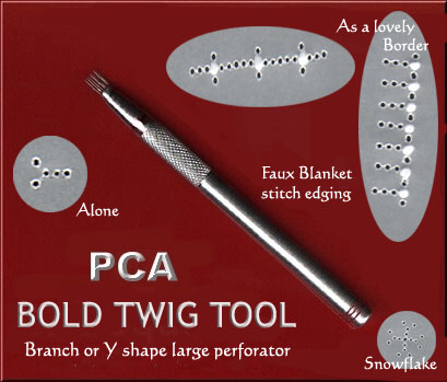 PCAのオリジナルツールには浮かし模様を作る“エンボスツール”と穴あけ模様を作る“パーフォレートツール”、そして縁を切り落とすための“カッターツール”があります。 “パーフォレートツール”には、ボールド(肉太ゲージ)とファイン(細目ゲージ)のサイズがあり、ファインはLinda Hoad, Pergamano, Emily Younkins, Jackie X など、一般的なヨーロピアンデザインに適しており、ボールドはラテンアメリカンスタイルのデザインや、レース部分が多いデザインに適しています。もちろん両方を組み合わせたオリジナルデザインを作ることもできます。