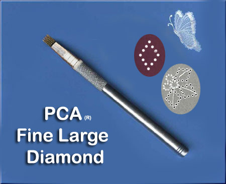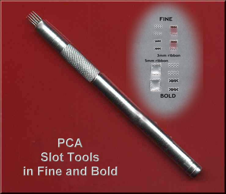 PCAのオリジナルツールには浮かし模様を作る“エンボスツール”と穴あけ模様を作る“パーフォレートツール”、そして縁を切り落とすための“カッターツール”があります。 “パーフォレートツール”には、ボールド(肉太ゲージ)とファイン(細目ゲージ)のサイズがあり、ファインはLinda Hoad, Pergamano, Emily Younkins, Jackie X など、一般的なヨーロピアンデザインに適しており、ボールドはラテンアメリカンスタイルのデザインや、レース部分が多いデザインに適しています。もちろん両方を組み合わせたオリジナルデザインを作ることもできます。